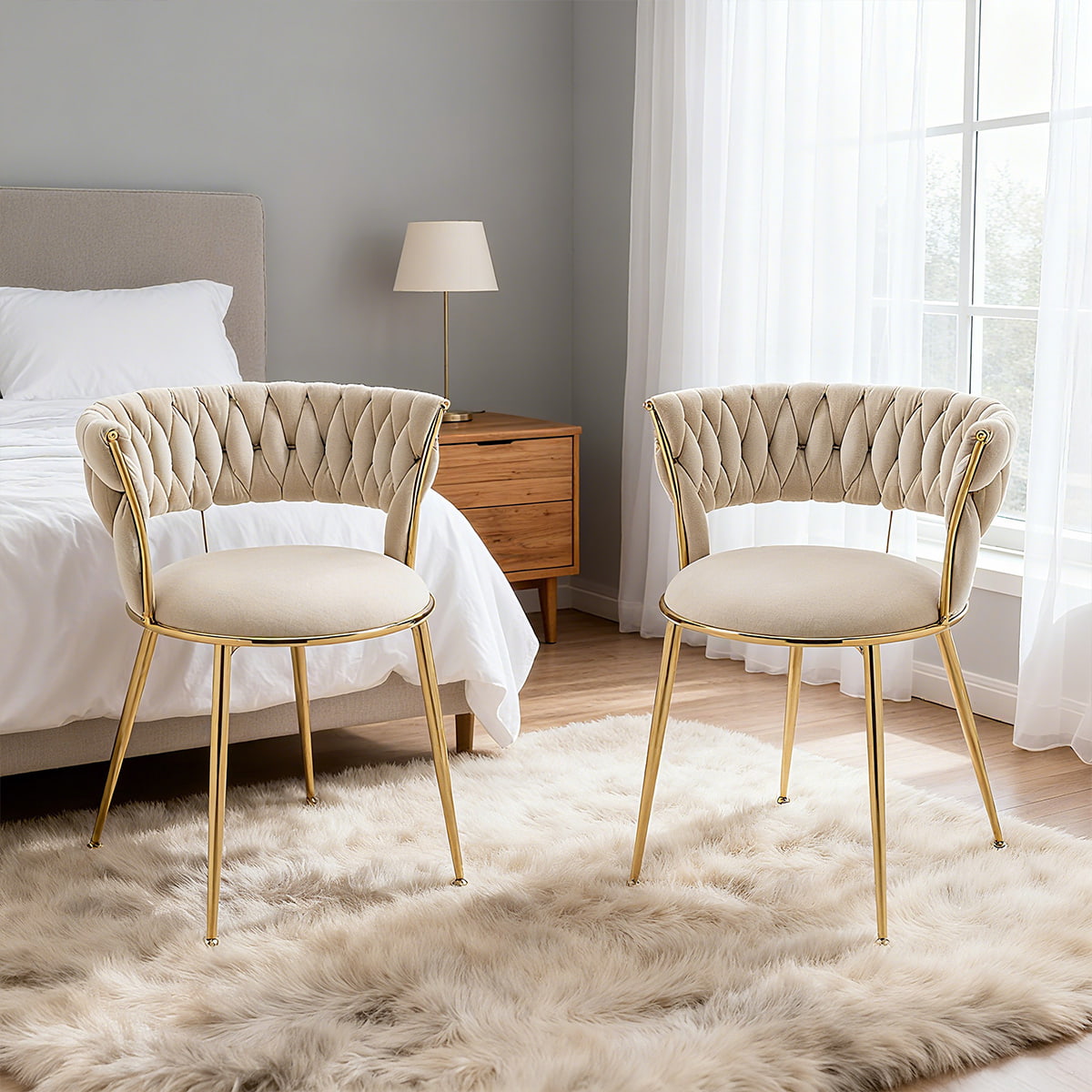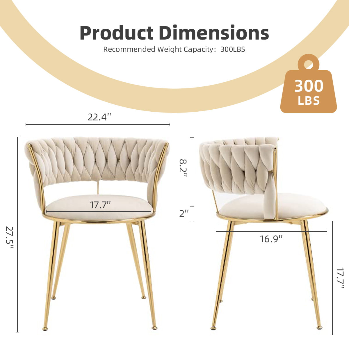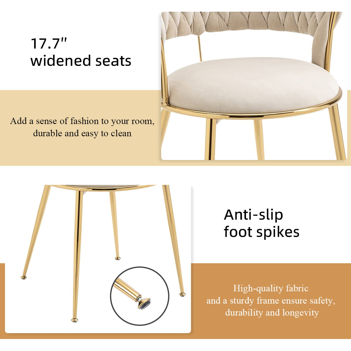 Moderner Esszimmerstuhl aus elfenbeinfarbenem Samt mit gewebter Rückenlehne und goldenen Metallbeinen – eleganter gepolsterter Akzentstuhl für Esszimmer, Küche oder Wohnraum