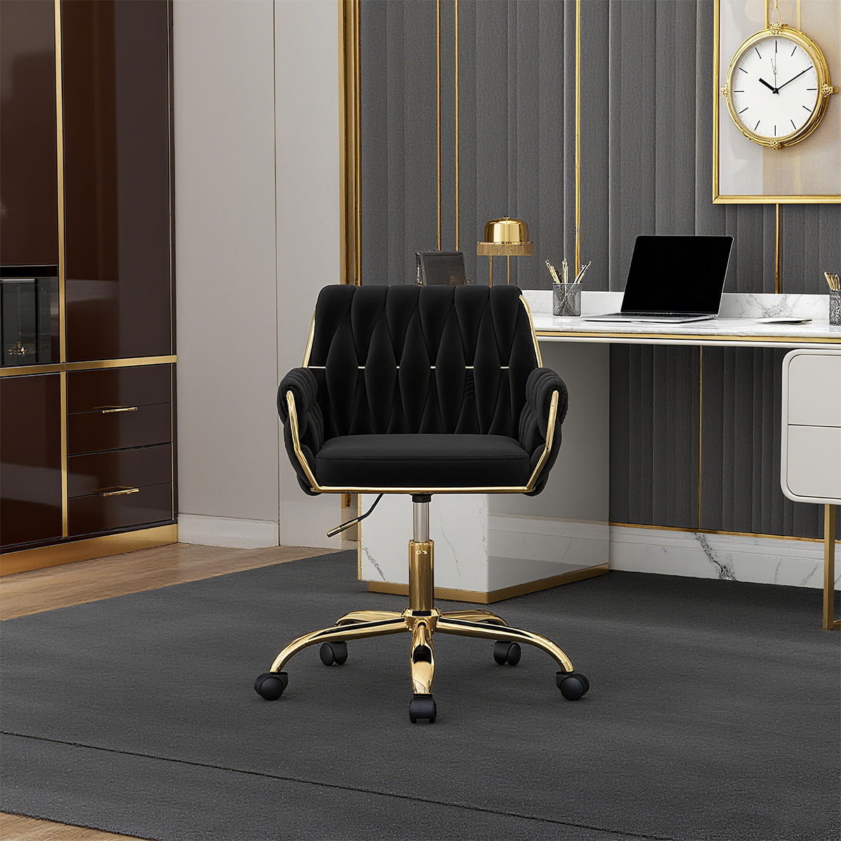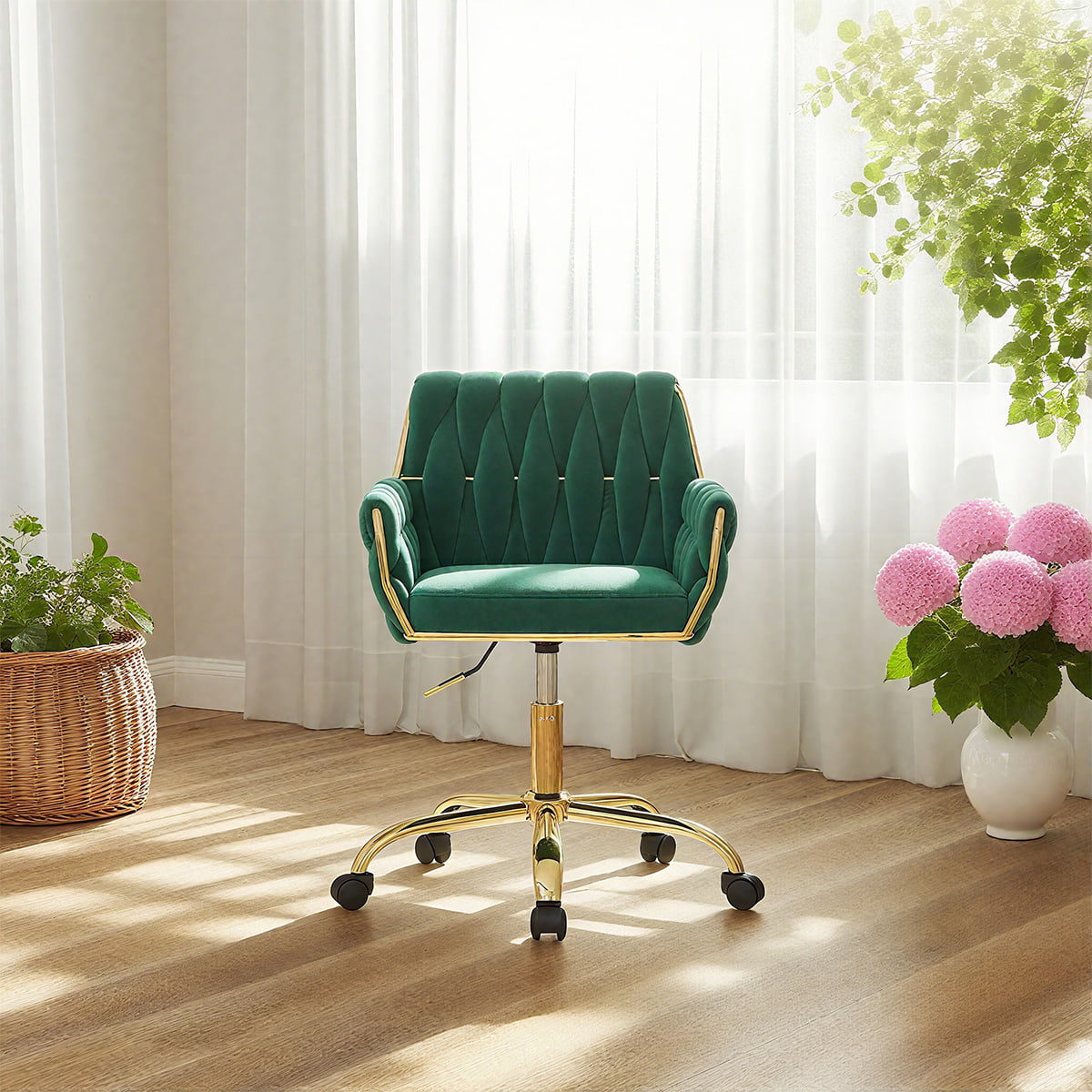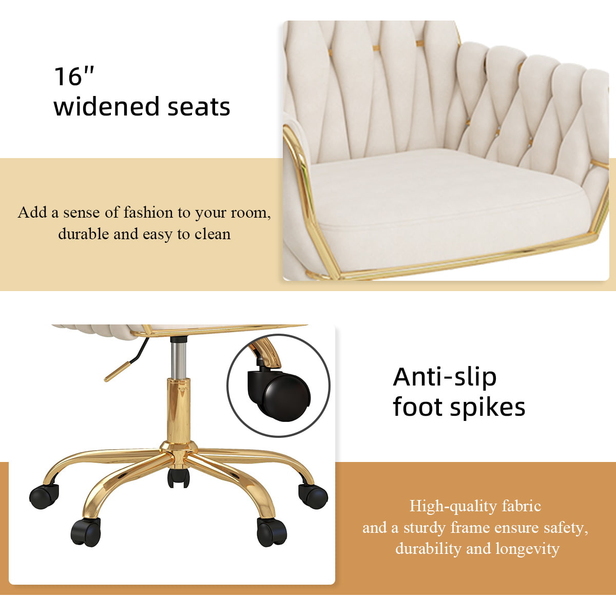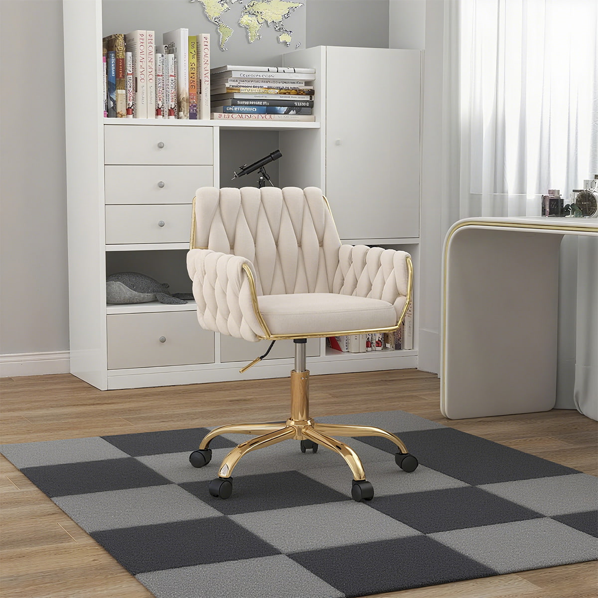Beigefarbener Samt-Heimbürostuhl – moderner, verstellbarer Schminkstuhl mit goldenem Untergestell, handgeflochtener Rückenlehne und Armlehne, um 360° drehbarer, rollender Schreibtischstuhl