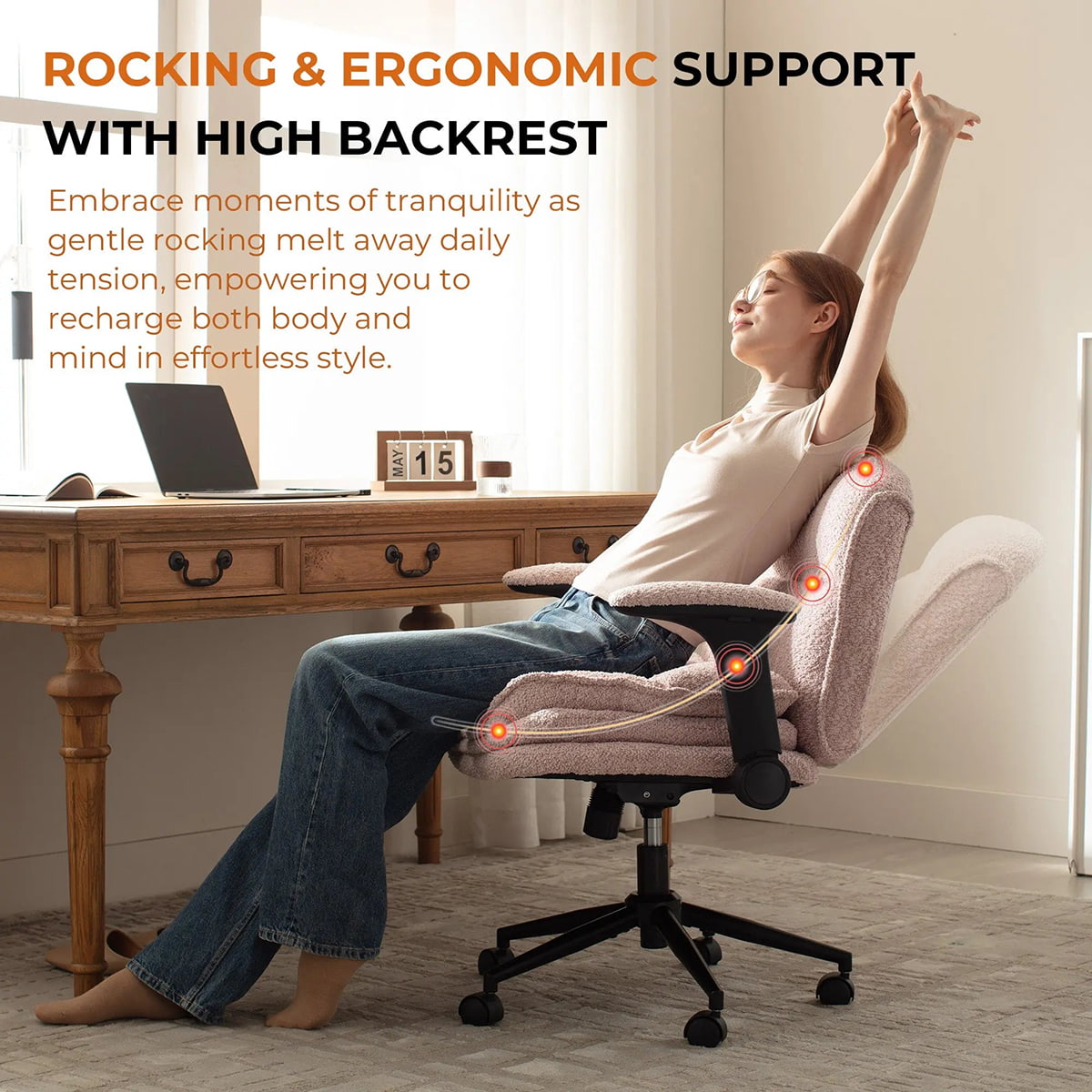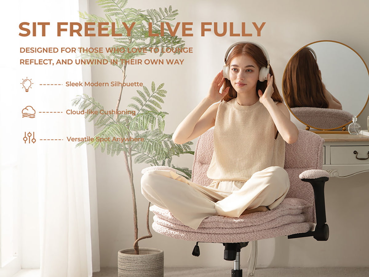 Hochklappbare Armlehnen maximieren die Flexibilität – Sie können problemlos im Schneidersitz, seitwärts, zusammengerollt oder aufrecht sitzen. Dieser Stuhl ist auf Komfort, Bewegung und Stil ausgelegt und eignet sich perfekt für Heimbüros, Schlafzimmer und kreative Räume.