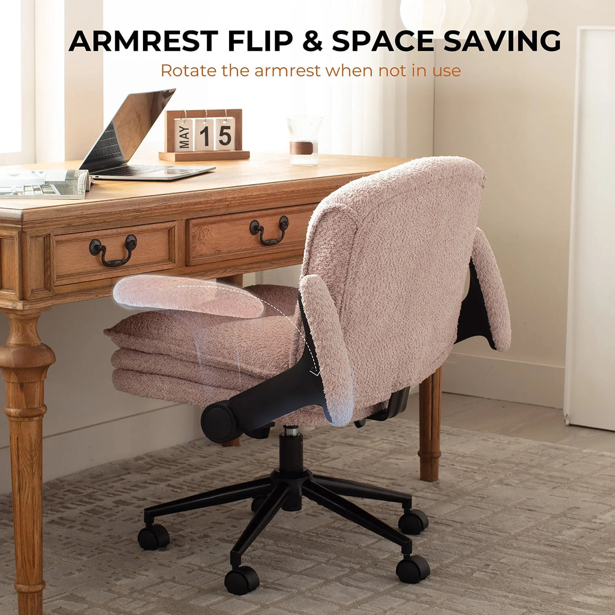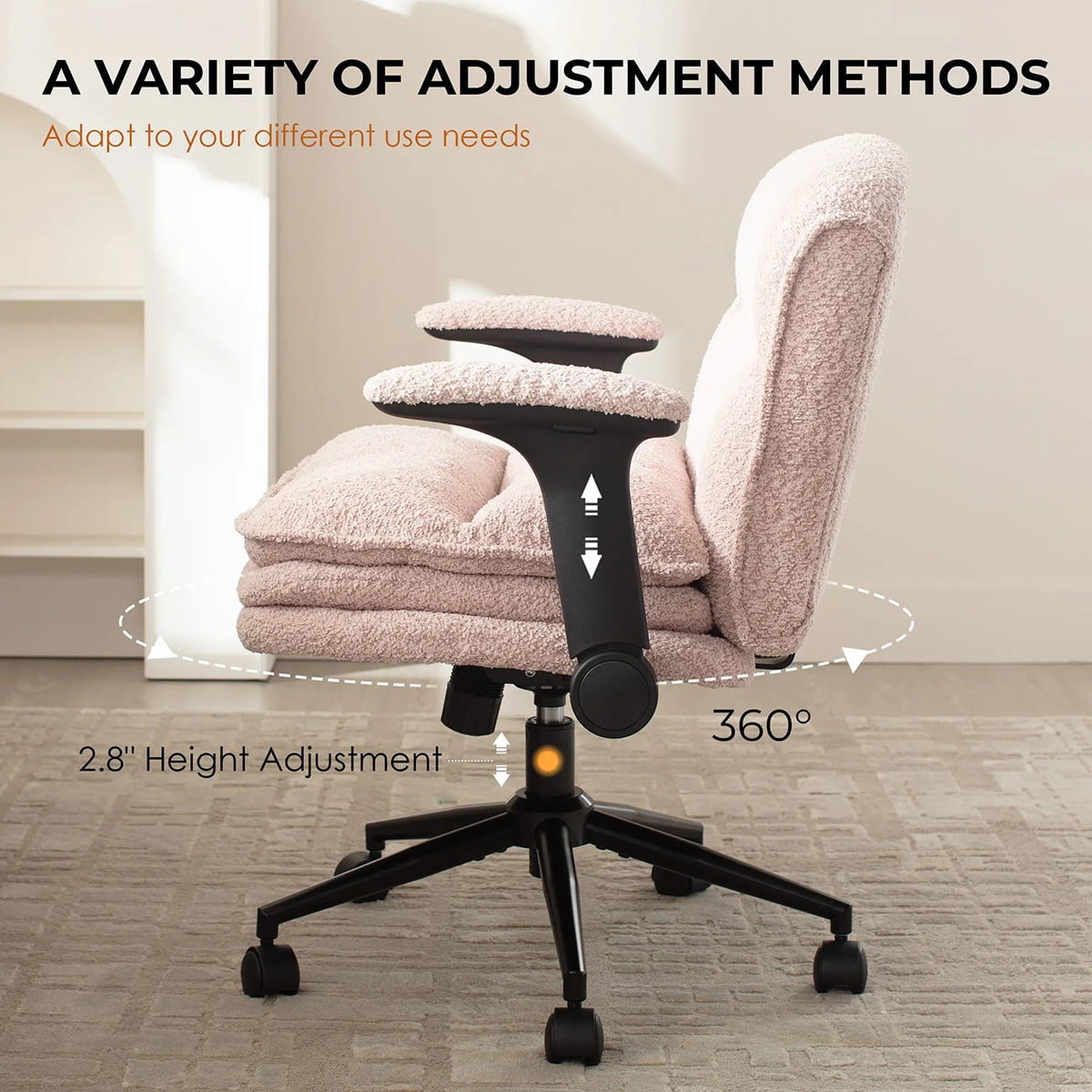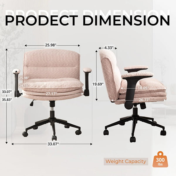 ① Criss Cross-Bürostuhl mit hochklappbaren Armlehnen und 3-lagigem Kissen – ergonomischer Bouclé-Schreibtischstuhl mit breitem Sitz und Rollen