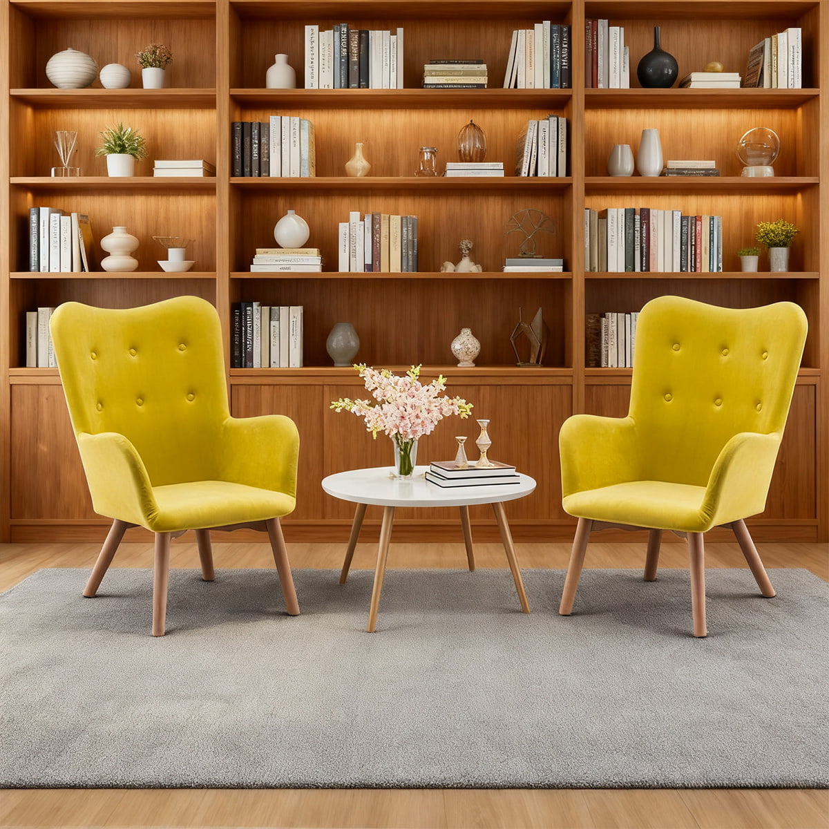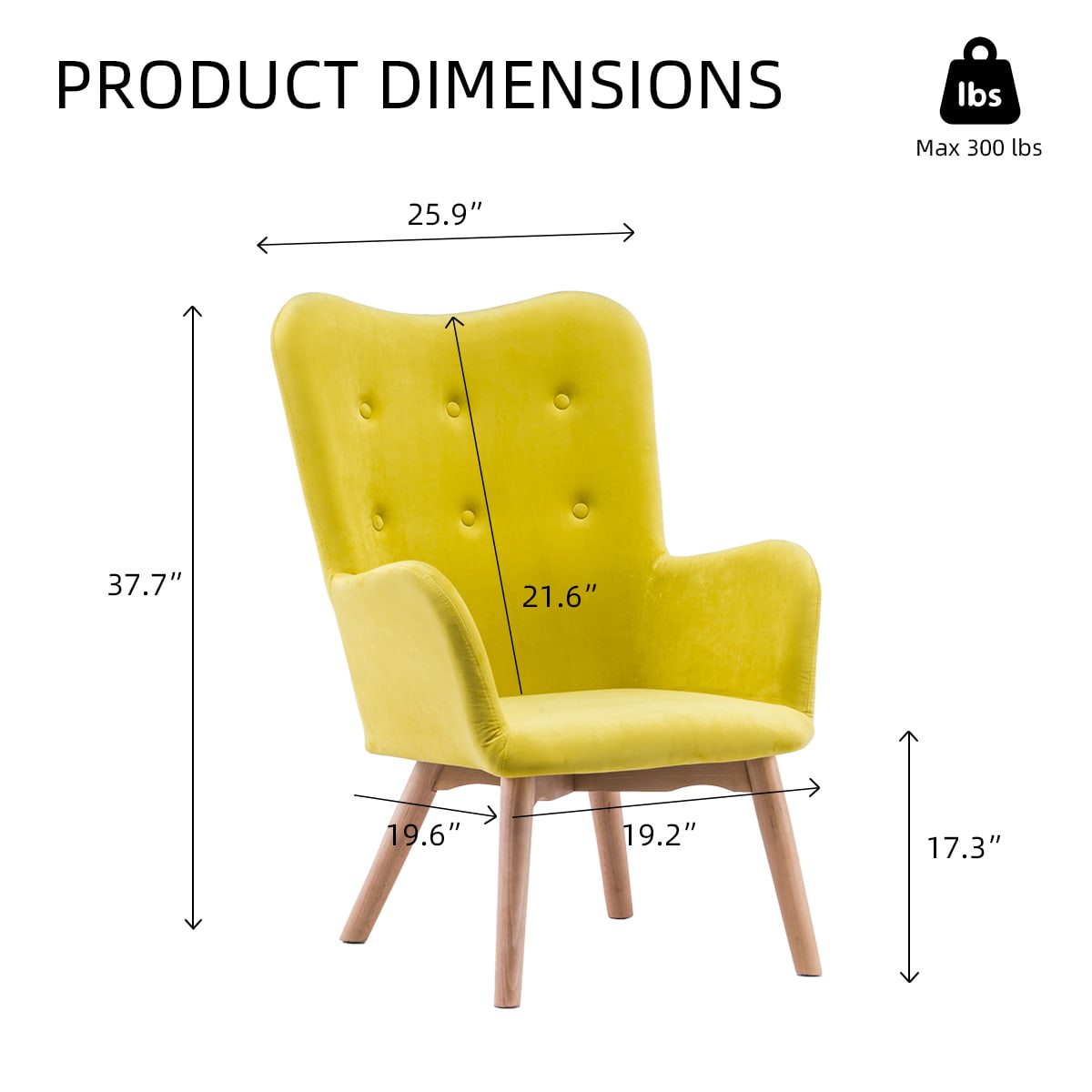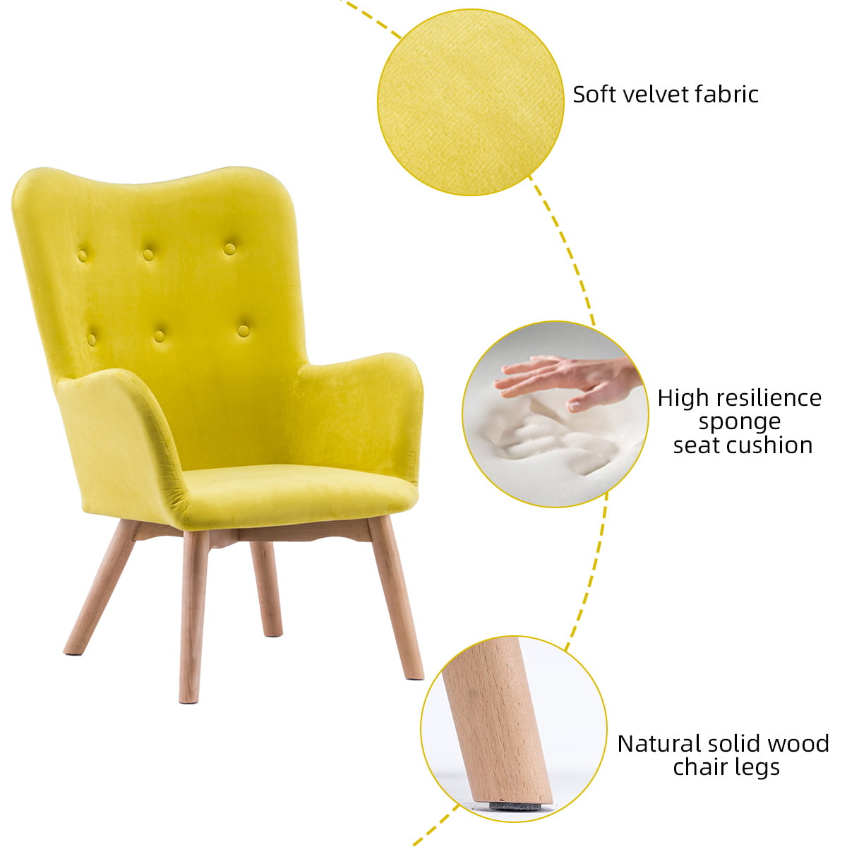 Moderner Akzentsessel aus gelbem Samt – getufteter Freizeitstuhl mit Ohrensessel mit Holzbeinen und Armlehnen für Wohnzimmer, Schlafzimmer oder Büro